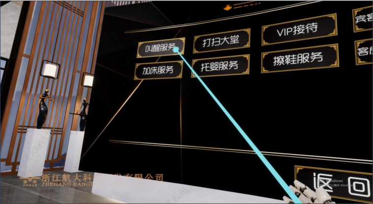 1.进入软件后,来到选择场所界面。用右手的射线点击选择“客房”场所。