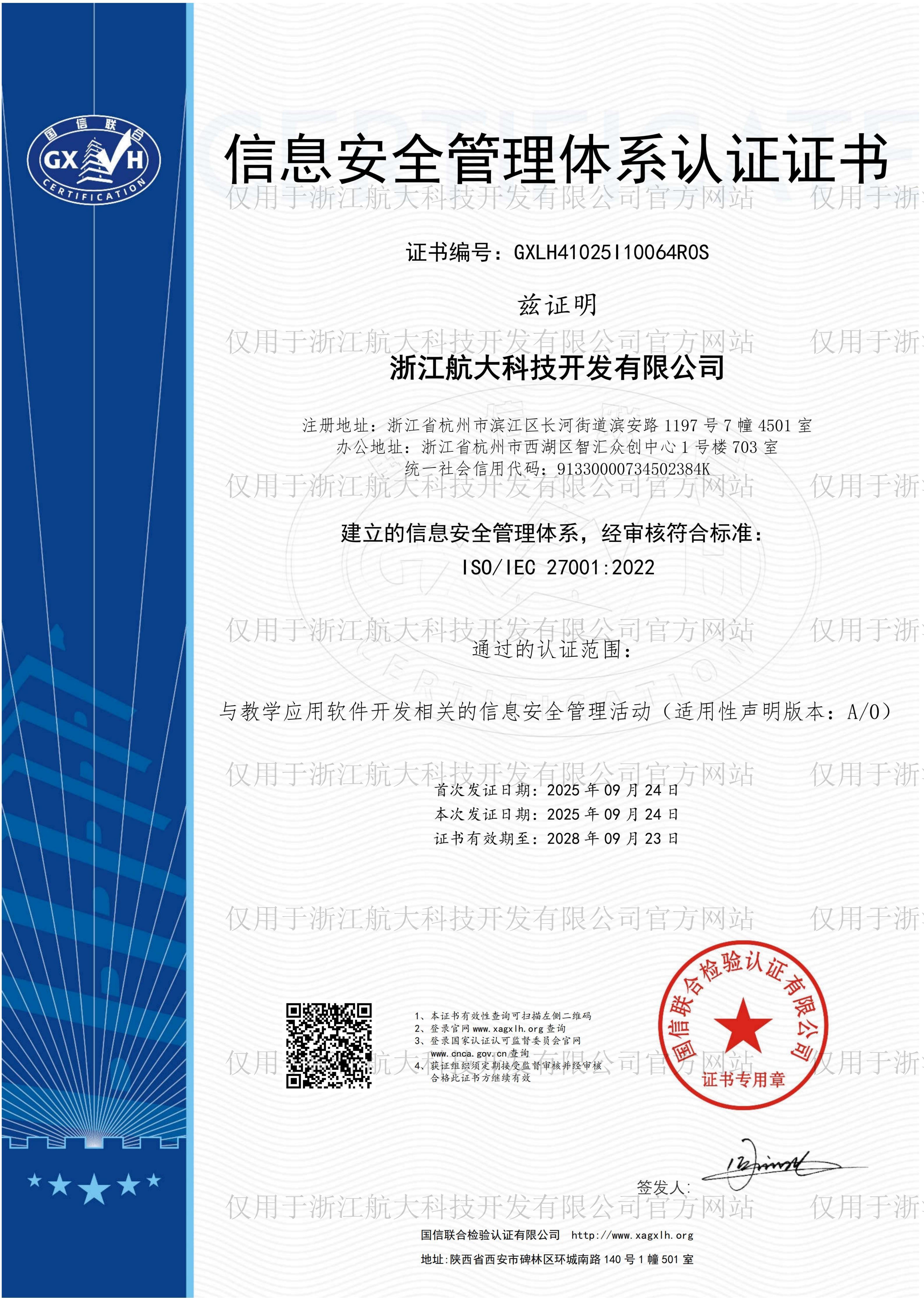 浙江航大科技开发有限公司(品牌浙科)——浙江省专精特新中小企业、国家高新技术企业、教育部产学合作协同育人项目公示合作单位、教育部供需对接就业育人项目公示合作单位、2024年中国国际大学生创新大赛产业命题公示单位、浙江省A级“守合同重信用”公示企业、 ISO9001质量体系认证、ISO27001信息安全管理体系认证、浙江软件协会会员单位,坐落在杭州市西湖区浙大森林科技园(浙大紫金港主校区旁),是一家集科研、软件开发、设备生产、销售服务于一体的典型的将科技成果转化为教育生产力的科技型综合性人工教育及移动互联网高新科技企业,在科技领域建立起了近二十年的品牌声誉。多年来,公司在高校实验室软件研发方面取得显著成就,成功研发了汽车、经管类、航天航空、护理、新能源等专业70余套教学实训、虚拟仿真平台及16个竞赛大平台,通过了国家信息产业部评定及国家专利认证,并获得省信息产业厅颁发的软件产品登记证书,曾多次在政府和院校采购招标中连续中标,荣获中国软件行业协会等各类认定机构的表彰,屡获千所高校及教育机构师生的一致好评和认可。公司秉承以“科技创新、发展为本、质量第一、信誉至上”为核心价值,紧跟教育教学和网络信息化发展趋势,不断研发、升级产品。
